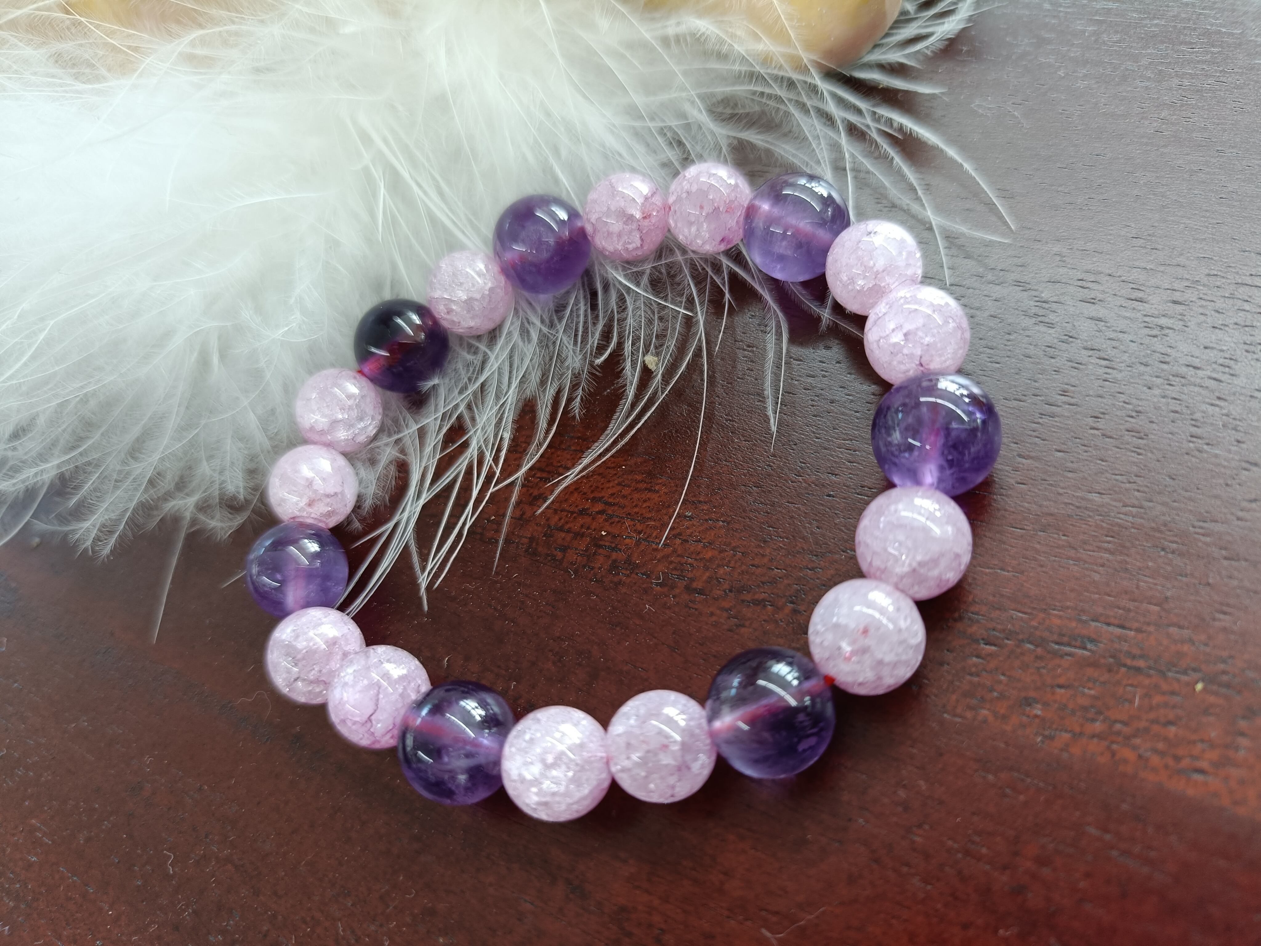 アメジストと水晶が組み合わさったこの特別なブレスレットは、心の安定を促進し、ポジティブなエネルギーを引き寄せる力を持つことで知られています。美しい紫色のアメジストと透明感あふれる水晶の組み合わせは、あなたの周りに穏やかな雰囲気をもたらし、身に着けることで心がクリアに整えられるでしょう。