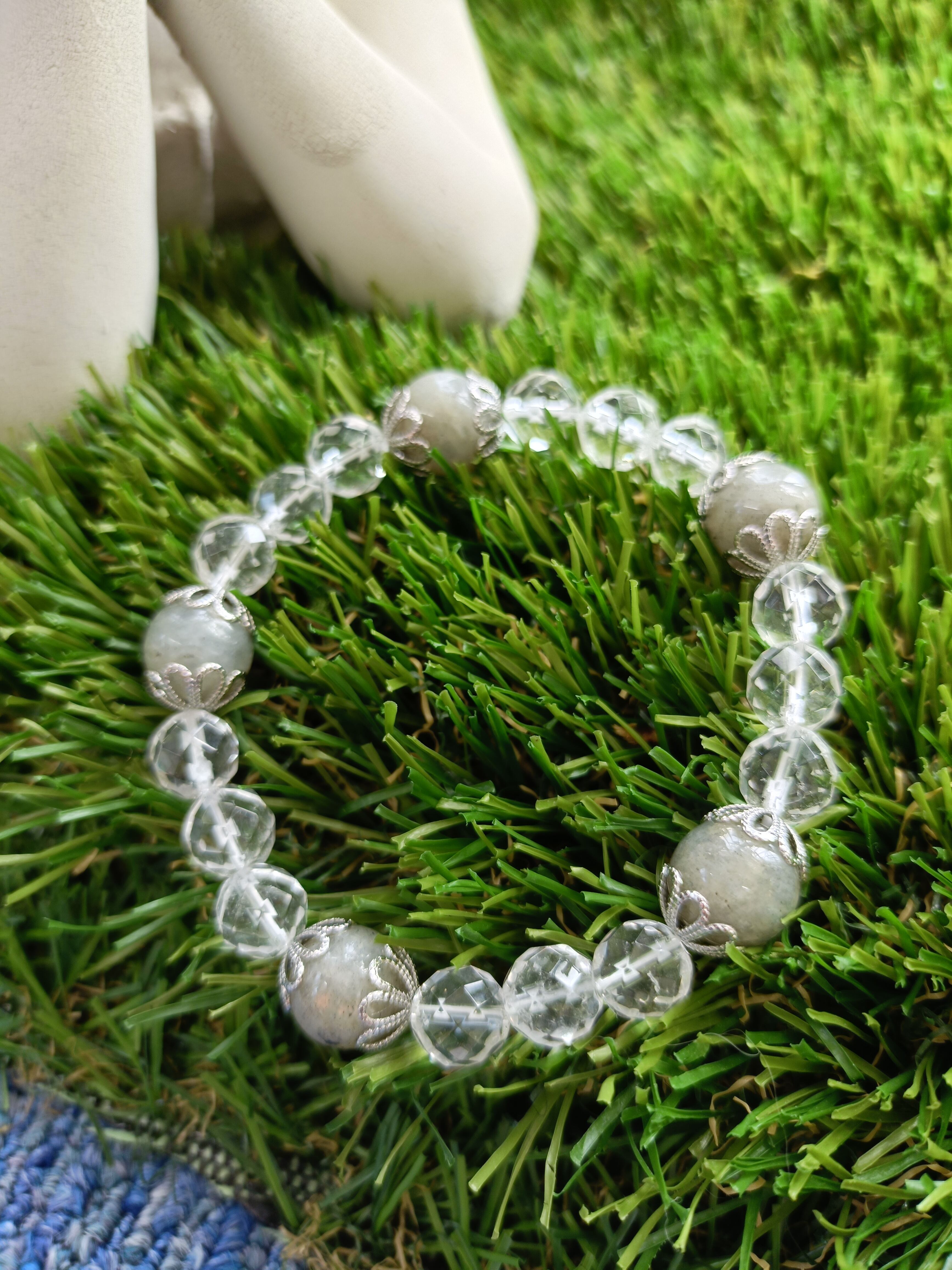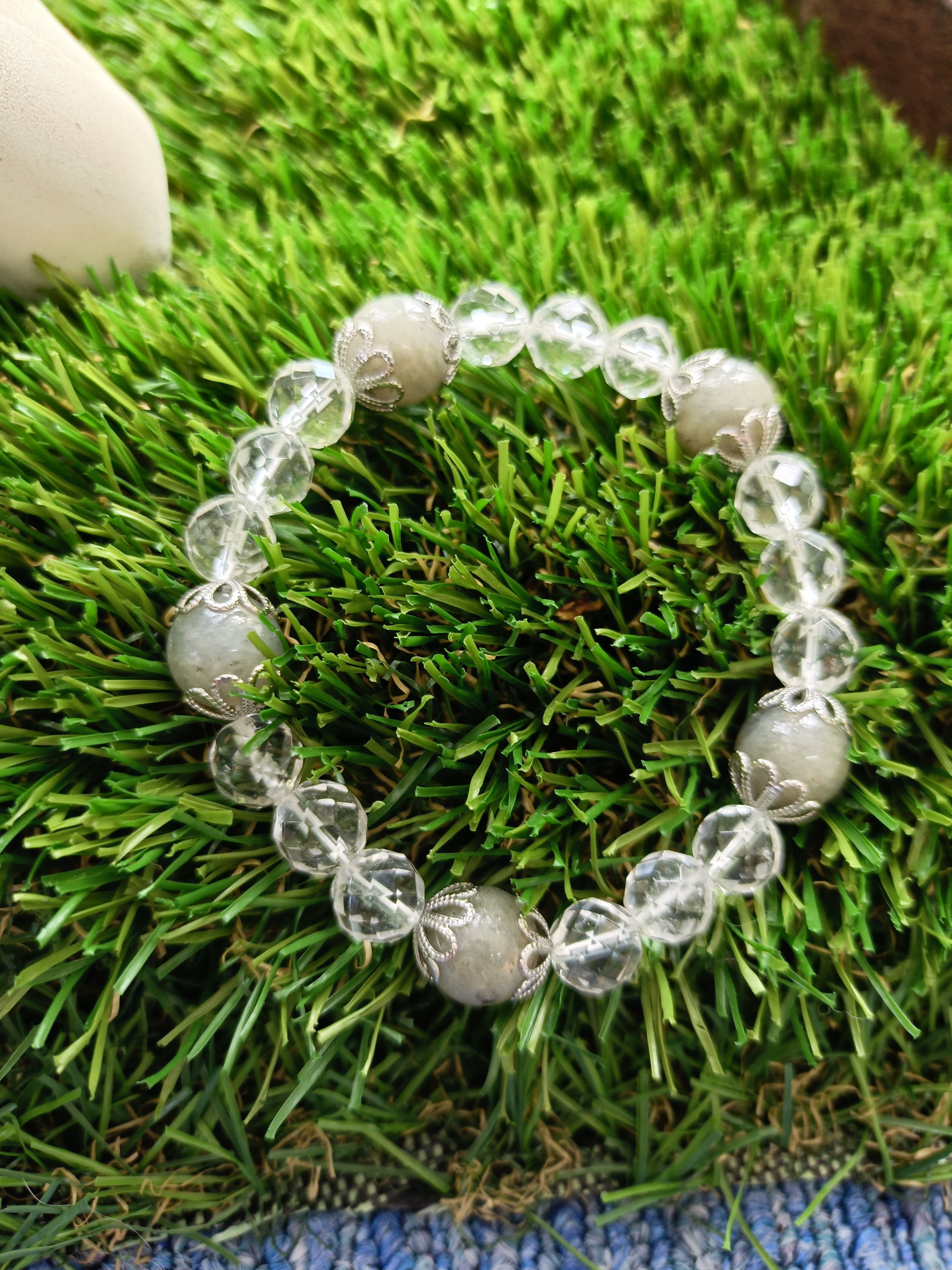 ラブラドライトと水晶が組み合わさったこの特別なブレスレットは、希望や豊かさを引き寄せるパワーを持っています。美しい青や緑の輝きが特徴のラブラドライトと、透明感あふれる水晶が組み合わさることで、身に着けるあなたにポジティブなエネルギーをもたらし、心に潤いを与えてくれることでしょう。