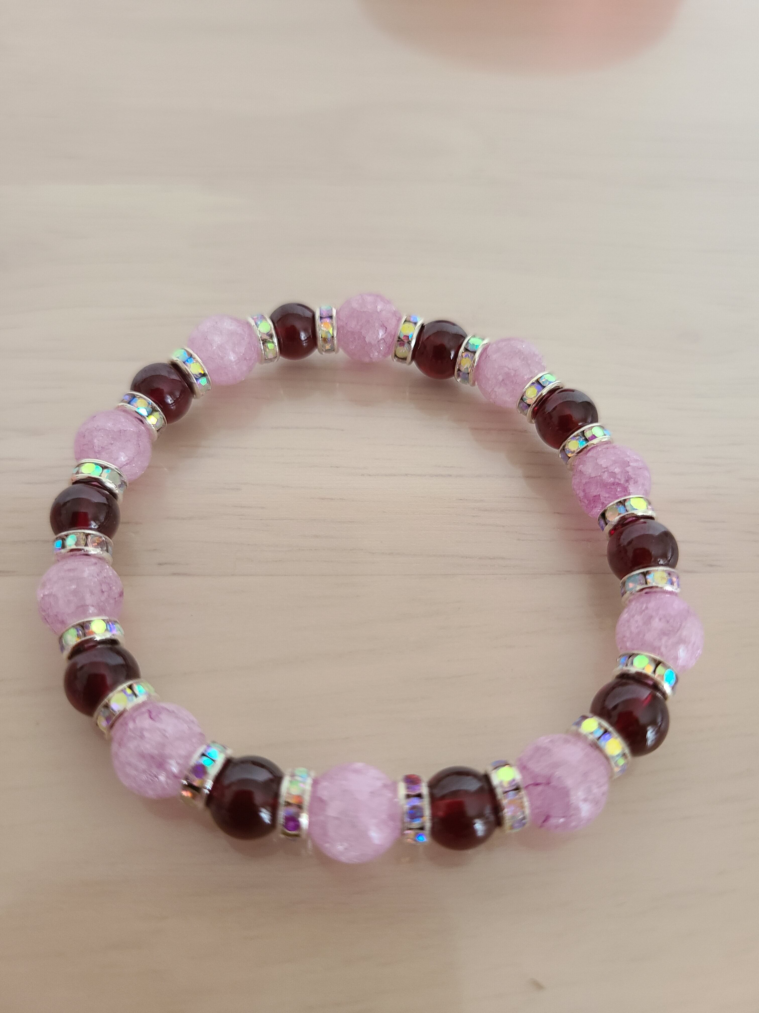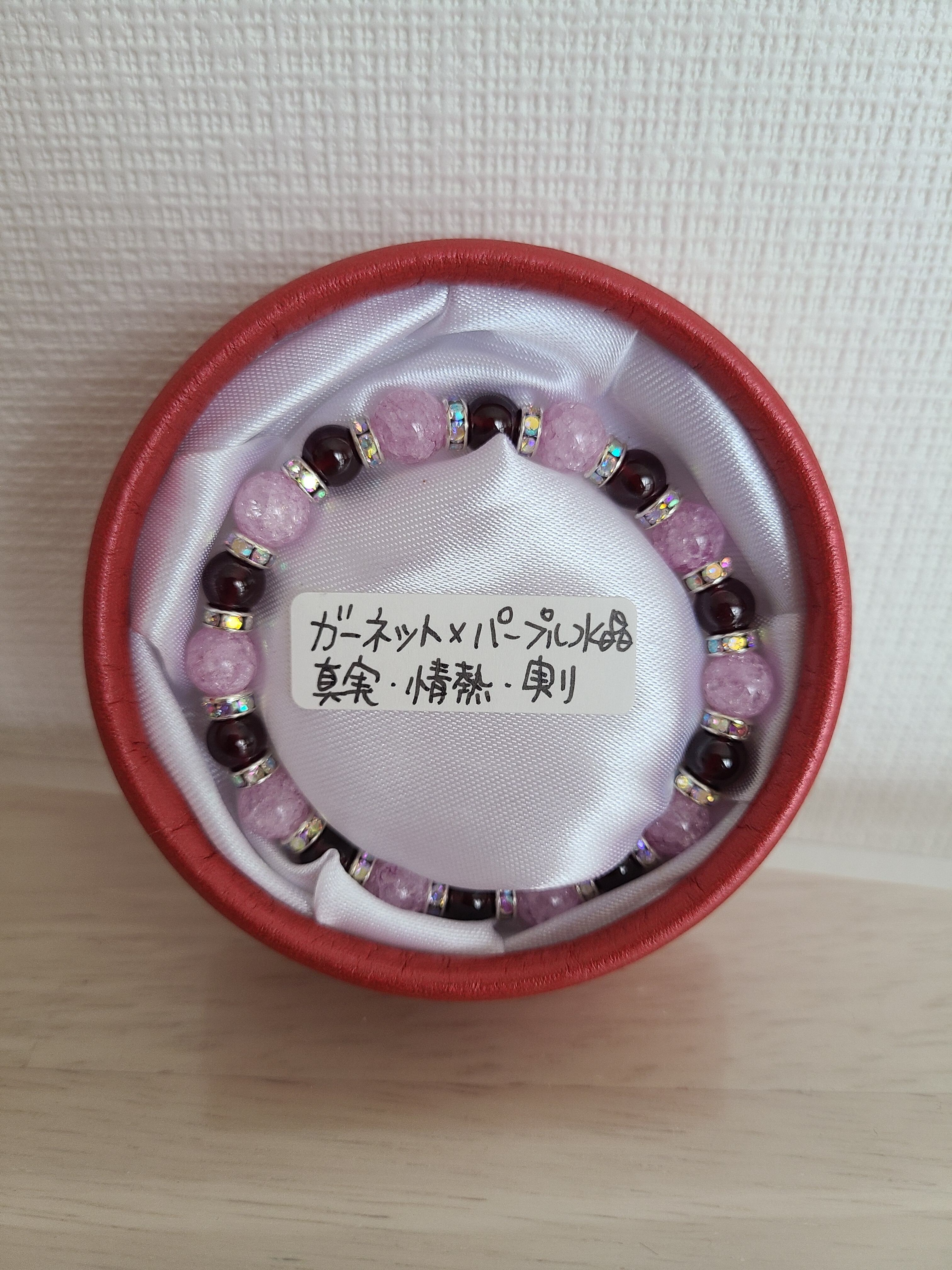 繊細なビーズの連なりが手首を美しく飾り、何気ない日常の中で身に着けるだけで気持ちが明るくなります。また、ガーネットとパープル水晶の組み合わせは珍しいため、他の人とは差をつけたい方にもおすすめです。
